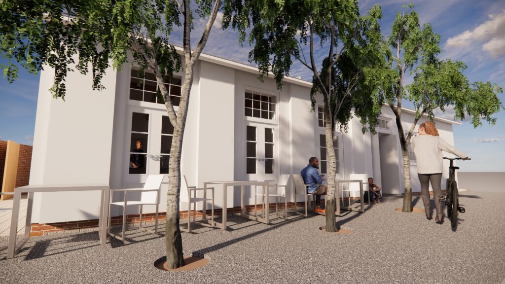 I then started exploring ways of making changes to improve access and accessibility, and to then explore improvements to the building fabric which could straightforwardly be made at the same time. So for example it seemed sensible to explore greater connection between the front elevation and the community; turning the three window openings in the front of The Old Library which occupied a chunk of the front elevation into glazed doors created a welcoming space with the potential for outside presence. A cafe and reading room – potentially with links to the part-time-opening library in the school opposite.